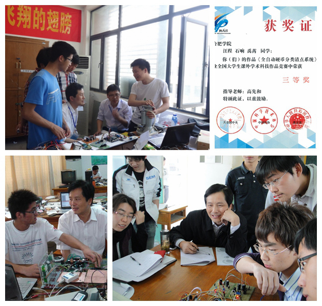 说起自己学生的成绩,高先和便滔滔不绝,没有什么比看到学生们在一次次竞赛中斩金夺银更加骄傲自豪的事。2009、2013年获得全国大学生电子竞赛一等奖,省内一等奖占比排在前列。在这些作品中,不乏被新华网、新安晚报等多家媒体争相报导的智能创新成果,如“硬币清点系统”利用传感器技术、根据硬币的材料不同判断其真假并进行分类,降低了许多假币损失,为公交车和银行省了不少麻烦,有很好的市场前景。“智能超市”使结账只需要几秒钟;“聪明座椅”让学生彻底告别早起占座。如今,高先和将团队工作室搬到同学们的研究地,让同学们参与产品设计的全过程,熟悉研发的必要科学环境。2013级电子信息工程系电协会长汪程同学表示,老师们的项目经验让自己在参加学科竞赛少走了不少弯路。因为高老师白天有教学任务,所以经常凌晨三点多,这里还是灯火通明,师生们还在互相交流、修改完善项目。